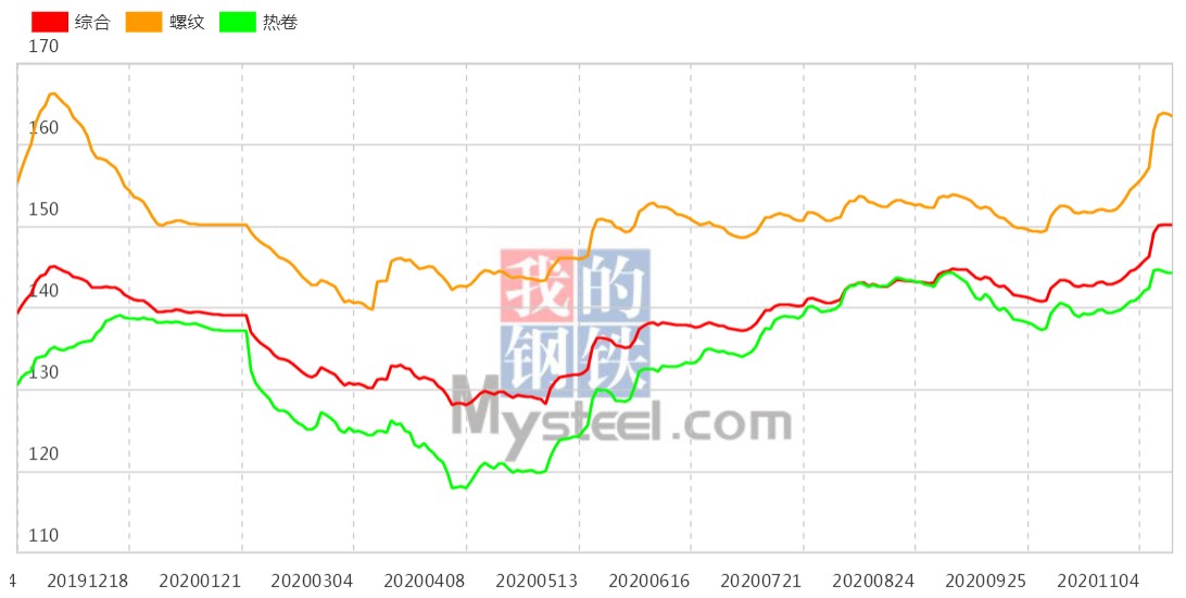 本周Myspic綜合指數(shù)報(bào)150.24點(diǎn),較上一周上漲2.67%。其中,長材指數(shù)報(bào)169.19點(diǎn),較上一周上漲3.64%。本周建筑鋼材市場價(jià)格大幅上漲,全國25個(gè)主要市場螺紋HRB400(20mm)均價(jià)為4115元/噸,較上周上漲160元/噸。