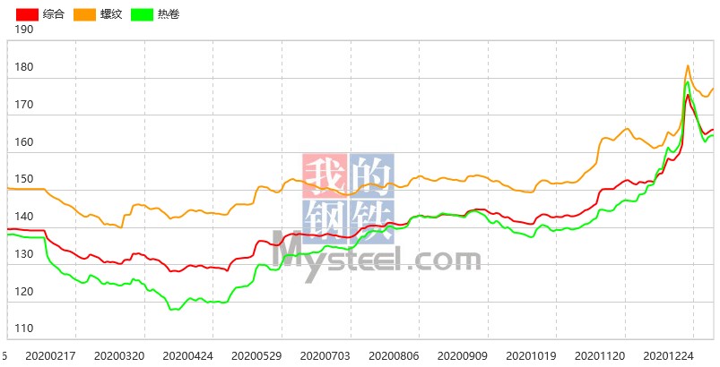 1月5日,國(guó)內(nèi)鋼材指數(shù)綜合指數(shù)報(bào)166.15(絕對(duì)價(jià)格指數(shù)4728),較上一交易日上漲0.17%。其中,螺紋鋼指數(shù)報(bào)177.18(絕對(duì)價(jià)格指數(shù)4478),較上一交易日上漲0.48%。熱卷指數(shù)報(bào)164.47(絕對(duì)價(jià)格指數(shù)4611),較上一交易日持平。